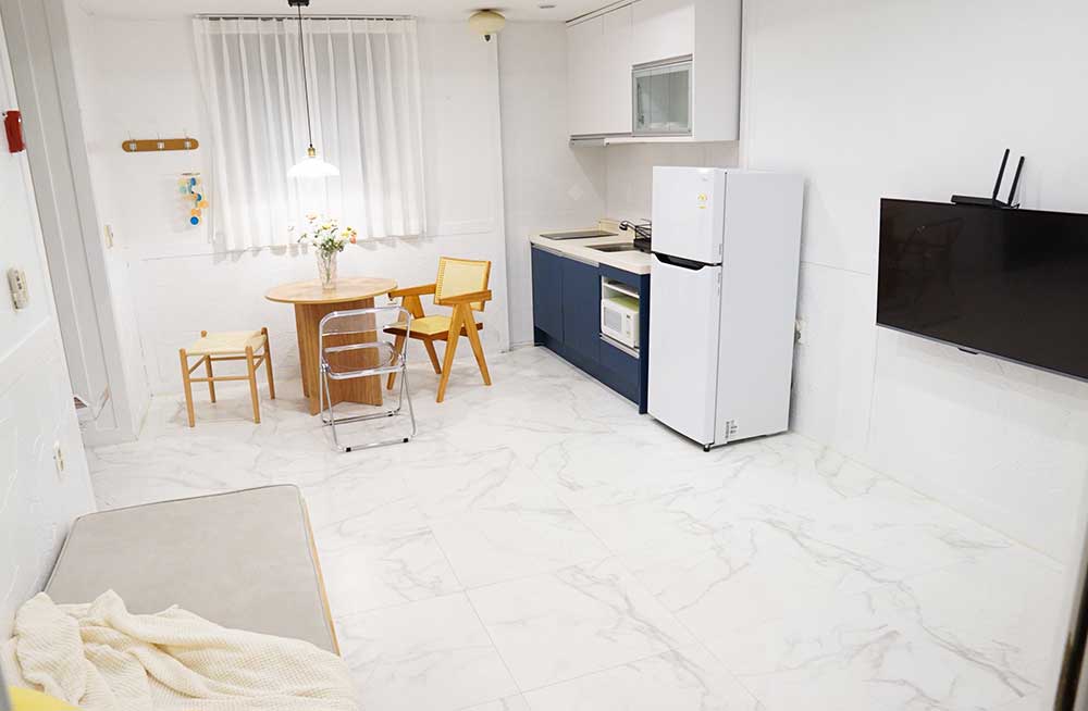 에어컨, 타월, 드라이기, 샴푸, 컨디셔너, 바디워시, 치약, 4인기본식기, 기본조리도구(냄비,칼,가위,집게,접시,컵 등), 인덕션1구, 냉장고, 주방세제, 수세미, 행주, 식탁, 와인잔, 와인오프너, 무선와이파이